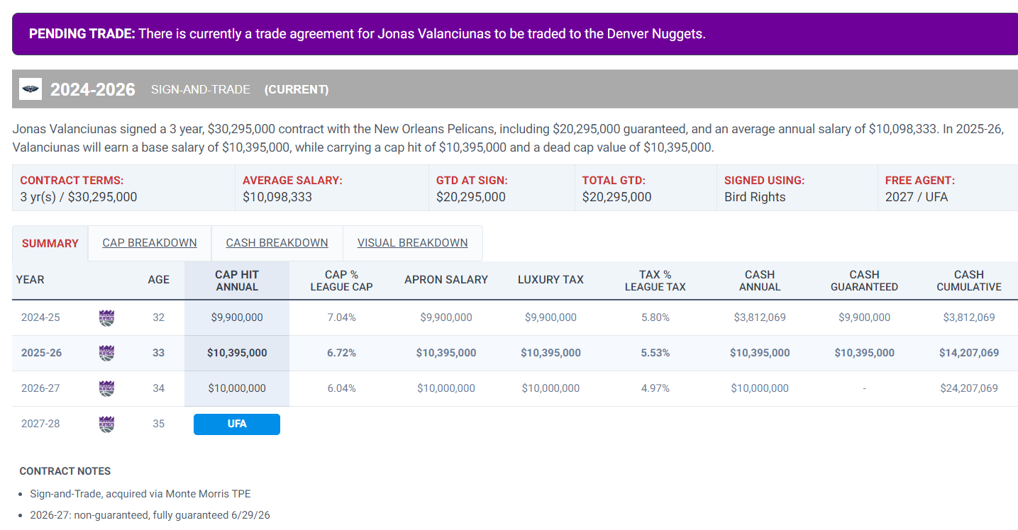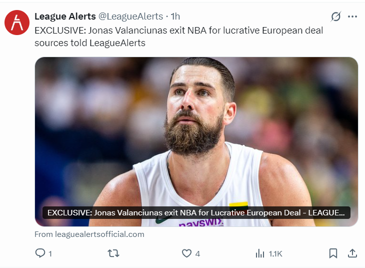 瓦兰的合同是2024年夏签下的三年3029万,下赛季是1039万的薪水,26-27赛季价值1000万(不保障),换言之瓦兰是放弃了两年2000万的薪水重返欧洲。