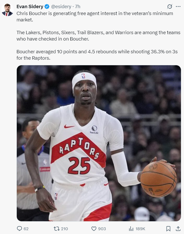 一旦瓦兰离开了NBA那么掘金队需要继续为约基奇找替补,上赛季效力猛龙的克里斯-布歇是一个不错的人选,目前已经有湖人、活塞、费城、开拓者、勇士等多支球队有意,他上赛季场均10分4.5篮板,三分命中率36.3%。